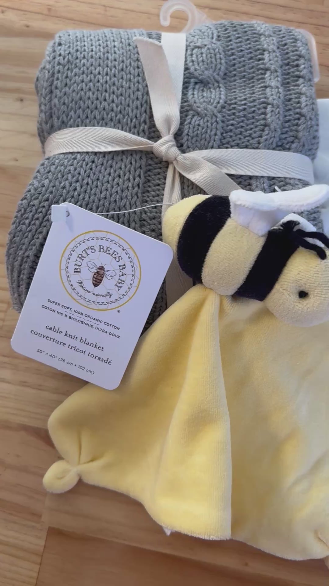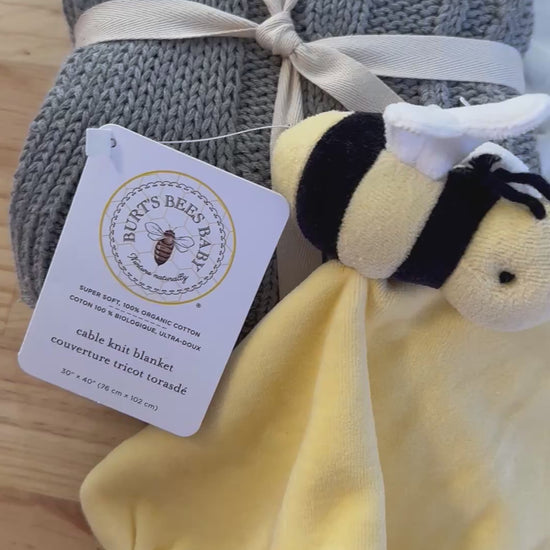A perfect, gender neutral gift set featuring an ultra soft cable knit blanket, quilted sleep sack, bee kind onesie, and a bee shaped plush lovey.