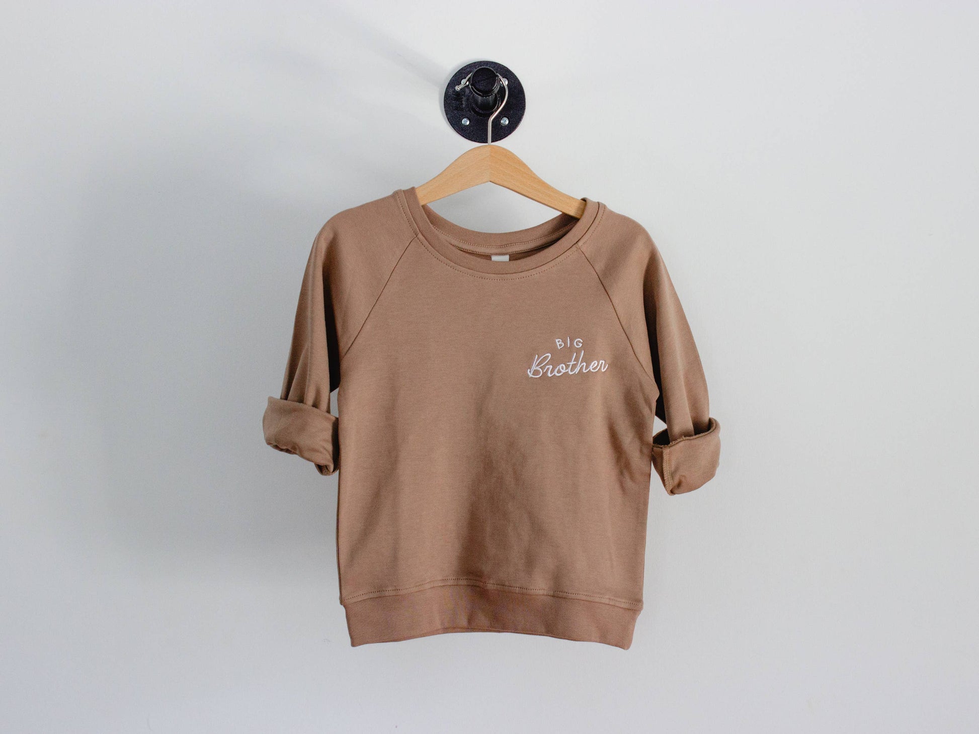 Lightweight and stylish, these long sleeved tops make the perfect announcement or photo outfit for a proud "big brother." Truffle color is a muted, tasteful brown neutral. Original design features modern script and sans serif typography in crisp white thread, located on the upper left chest of the top. An elegant, understated design for brothers. • Available in baby and toddler sizes • Rib elastane cuff and neck • Sustainably and ethically produced • Embroidered in our Ohio studio • Original designs • 100% Organic Cotton