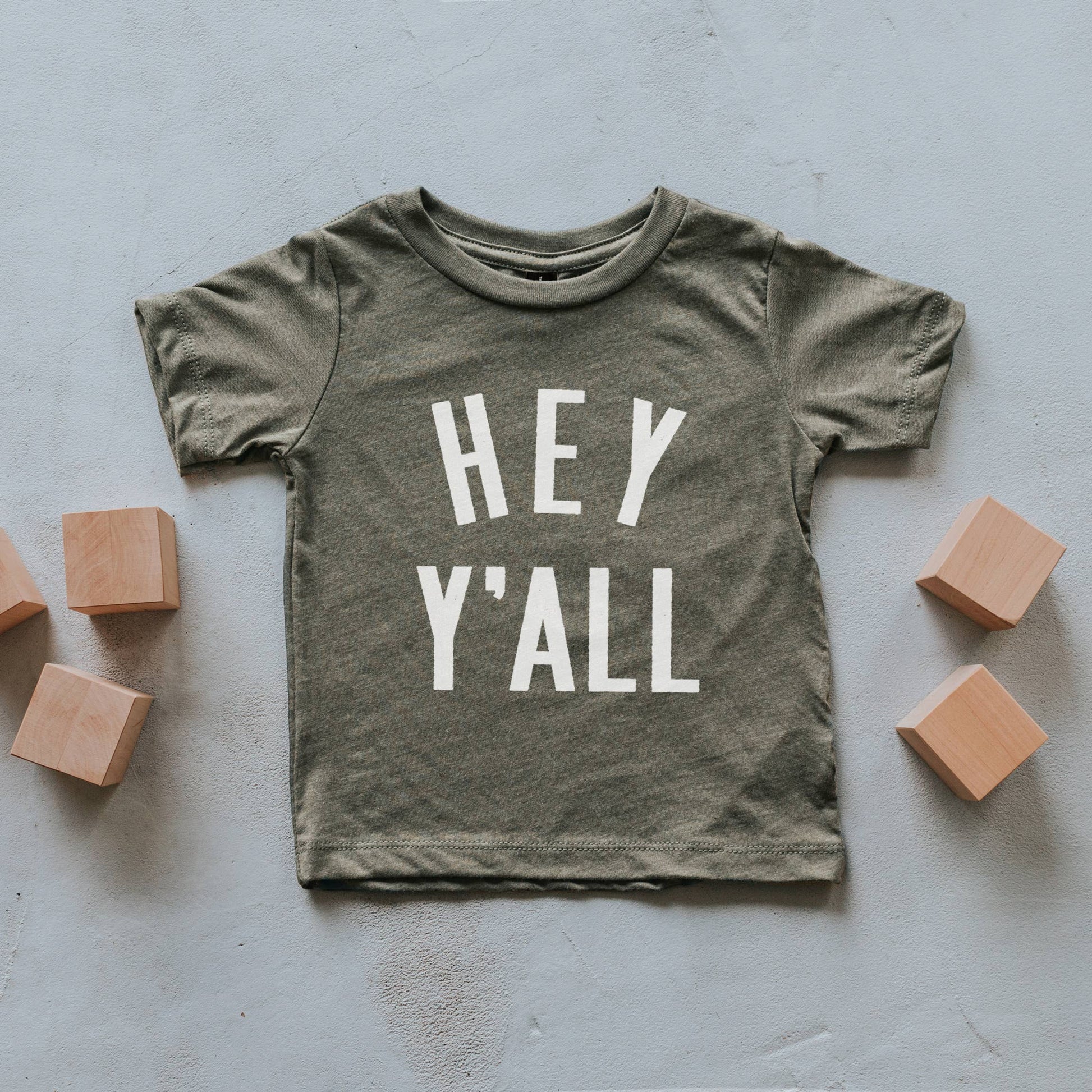 "Hey Y'All". Well hey there, little one! This fun kids shirt features modern, distressed typography in white ink on super soft tri-blend olive green fabric.