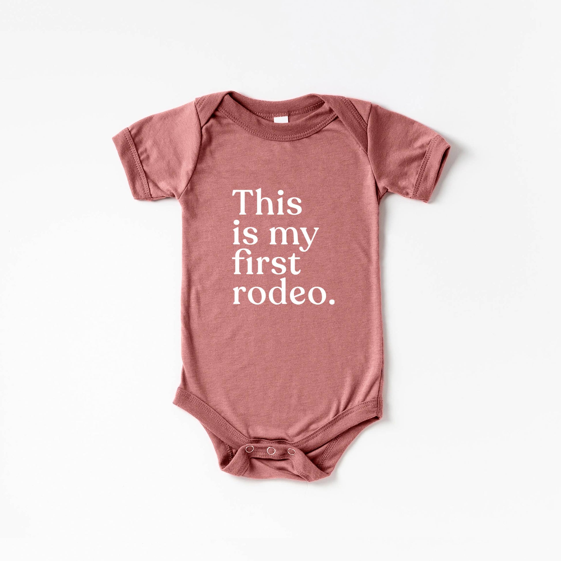 "This Is My First Rodeo" • For the newest little ones! This super-soft infant outfit features modern typography in crisp white ink on a luxe mauve pink colored bodysuit. perfect humorous outfit for a new babe! Features: • Water-based dyes • Sustainably sourced and ethically produced • Super soft tri-blend fabric • Short sleeves • Printed by Hand in Ohio
