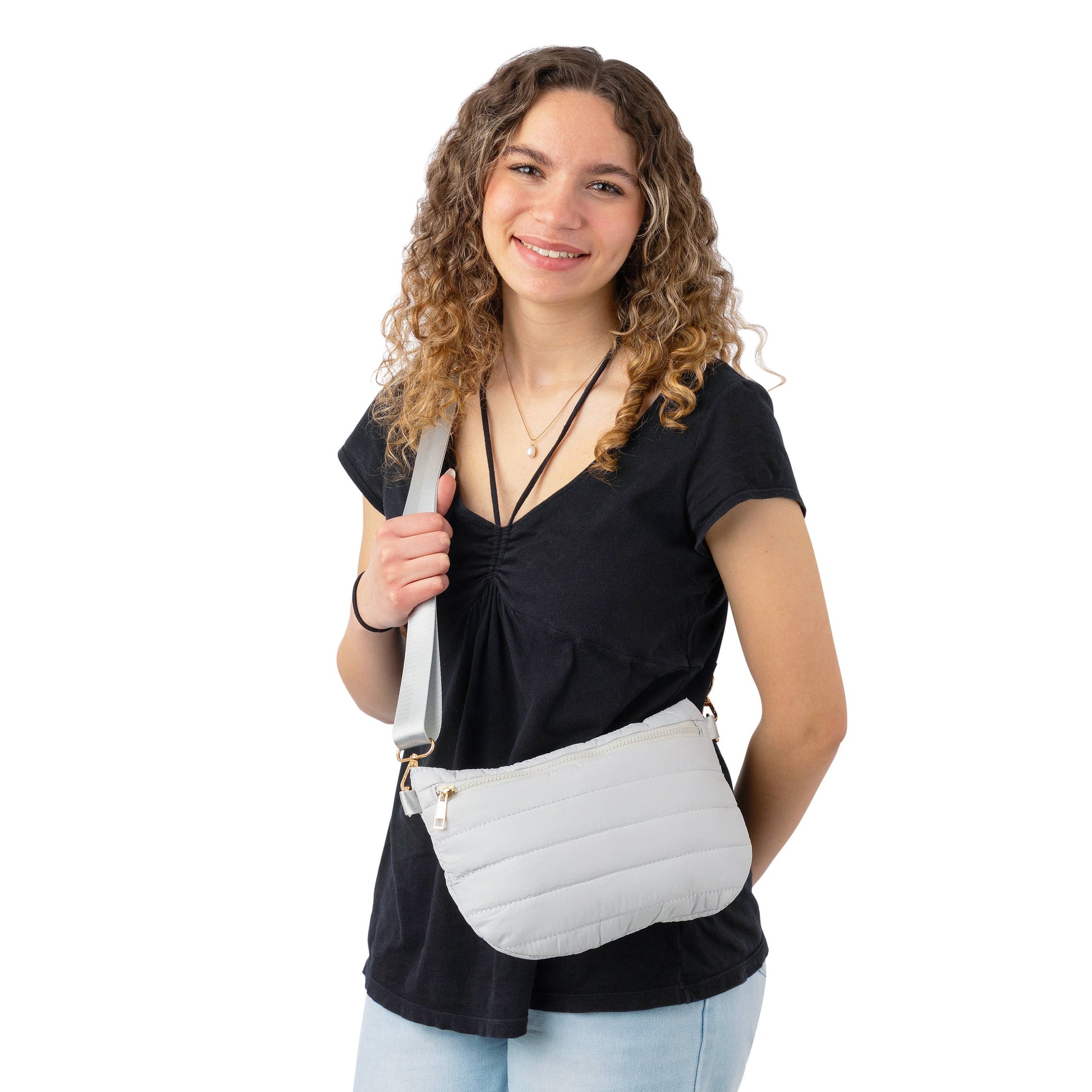 These puffer bags are perfect for a day out and about! These are extra large and can fit everything you need. The adjustable strap allows you to wear it at any length. Bag measures 12" x 8".