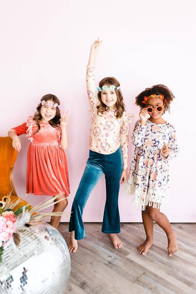 Our ruffle tee in vibrant prints is a favorite to pair with solid twirl skirts, leggings, or layered under a pinafore!