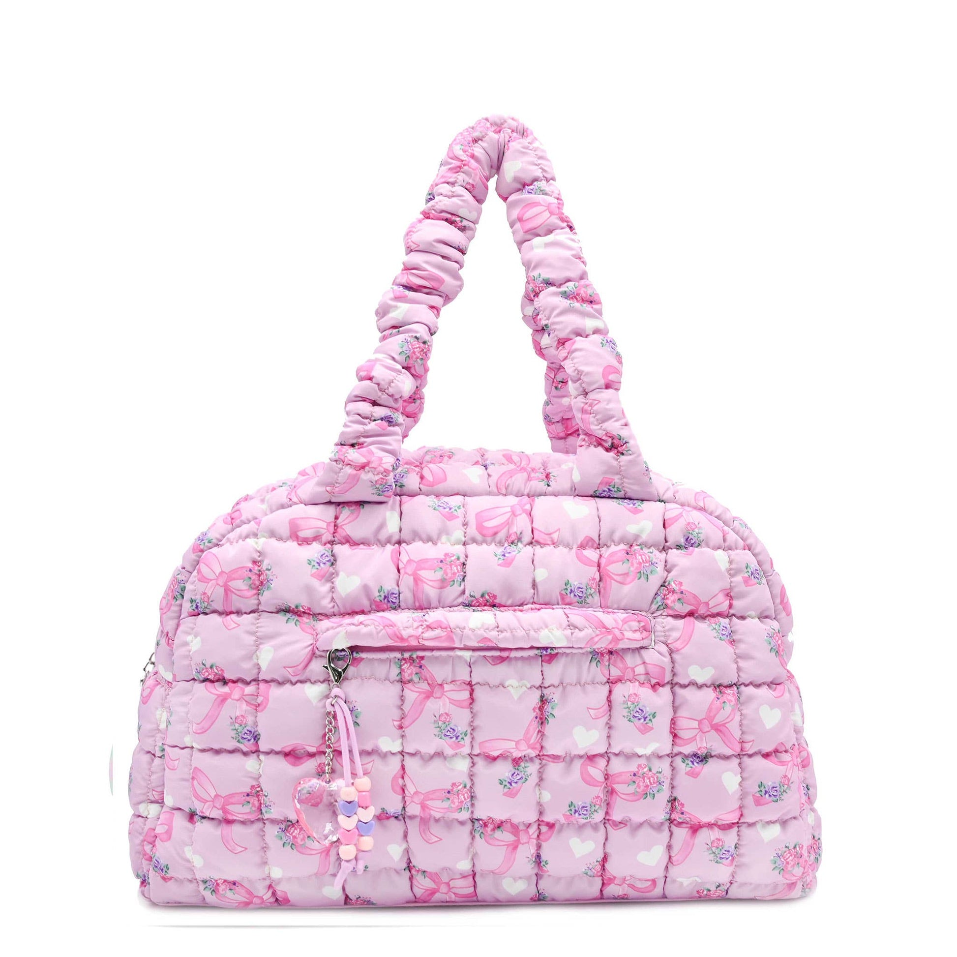 A girly girl's dream! Where style meets versatility, our favorite duffle bag silhouette gets a charming upgrade! For their extra curriculars, to the gym, dance class, weekend getaways, and everywhere else in between - they'll be carrying it all in our new nylon quilted bow printed medium duffle with a zipper closure front pocket- and a crystal heart charm included, of course!