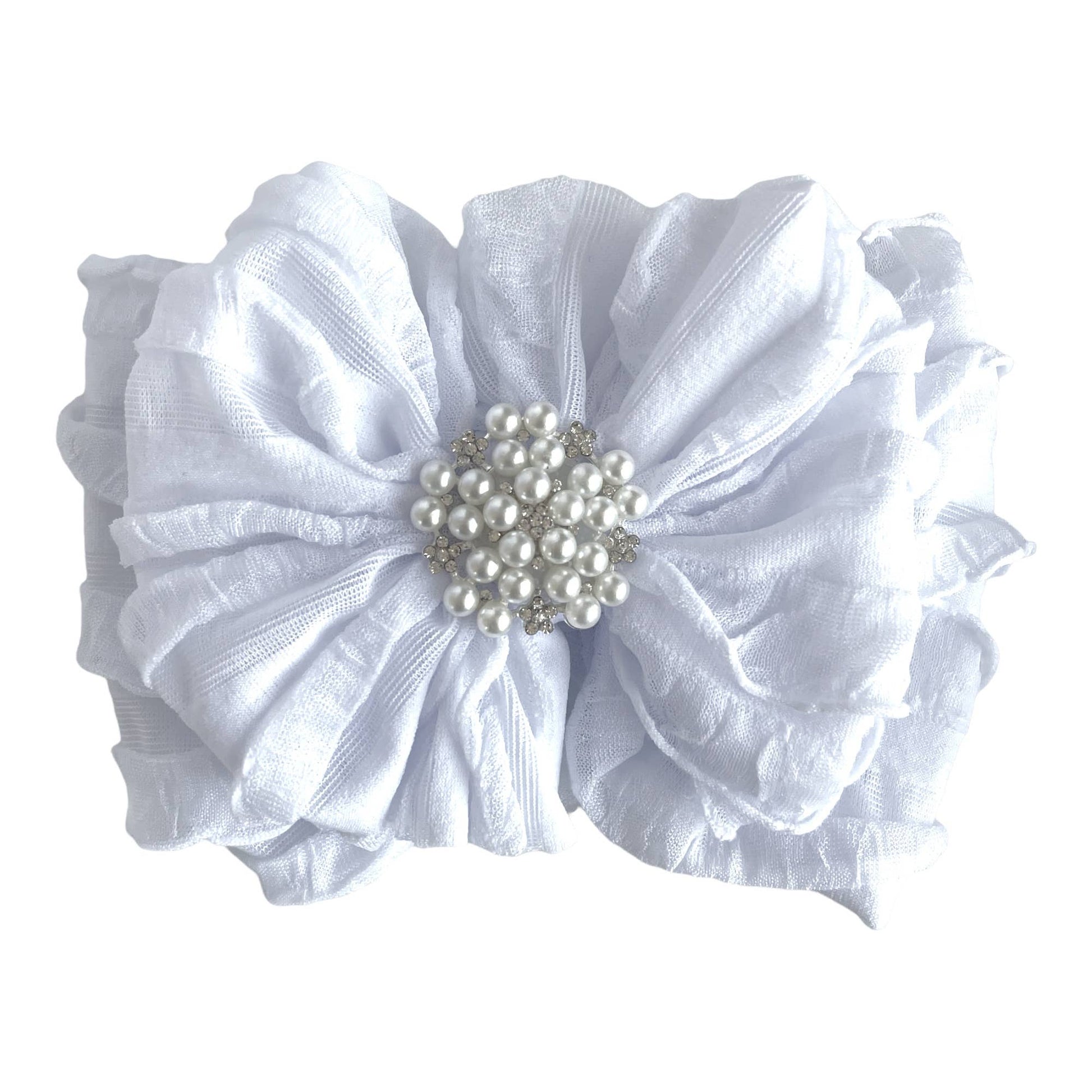 Ruffled Headband fits newborn to approximately 4 years. Embellished with a pearl cluster to add the perfect amount of glitz! This stretchy, soft, and cute headband is a customer favorite!