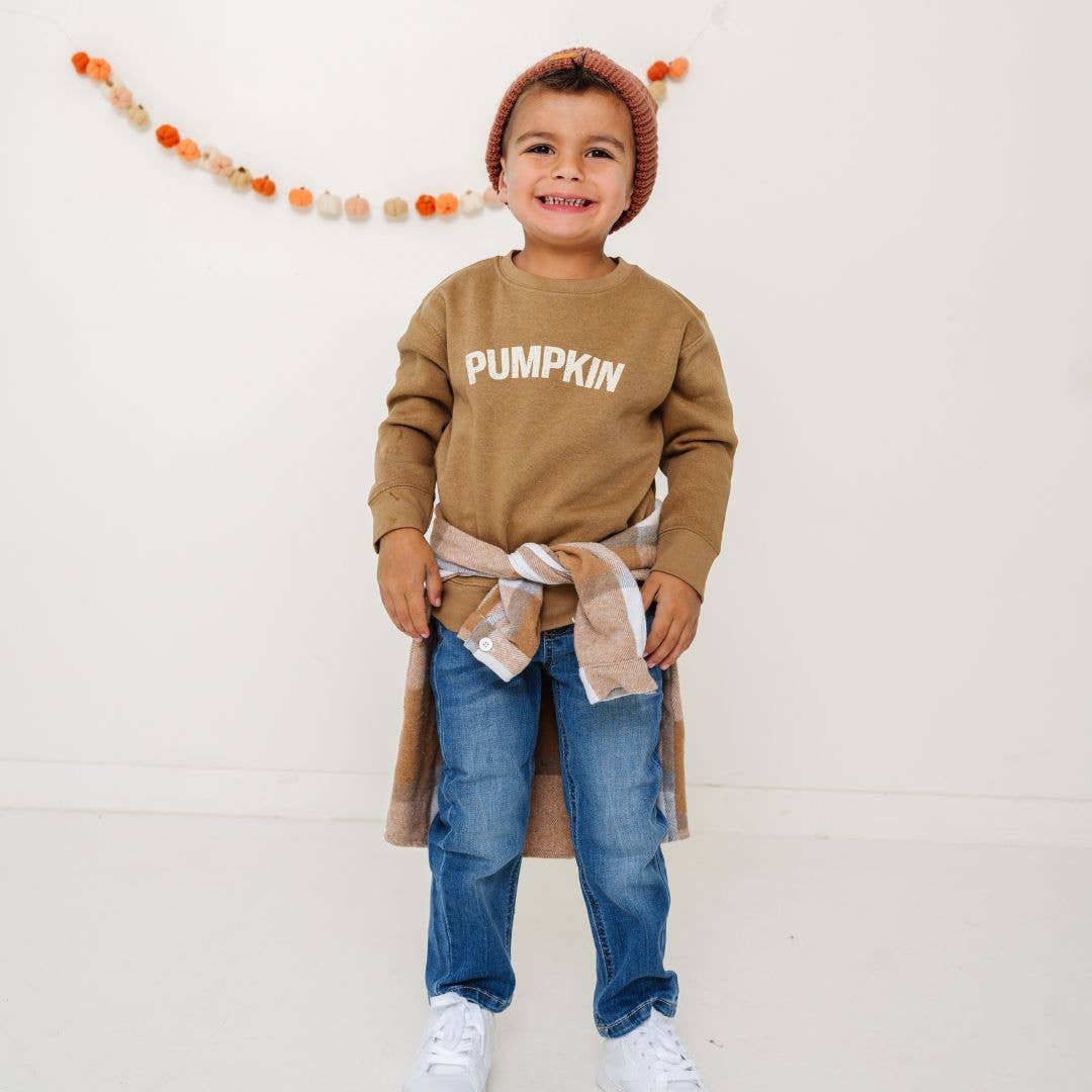 The Pumpkin Sweatshirt is a fun and festive sweatshirt for celebrating Fall! Features: *Crewneck Color: Mocha *Graphic Color: Sand *Material: 60% Cotton/40% Polyester Fleece *Features: Tagless inside neck label for an itch-free wear; cozy fleece lining *Fit: Toddler Unisex; True to Size *Care: Machine washable, tumble dry low, wash with like colors